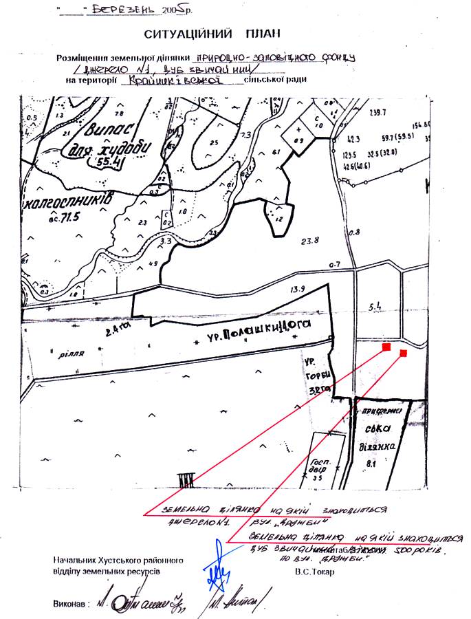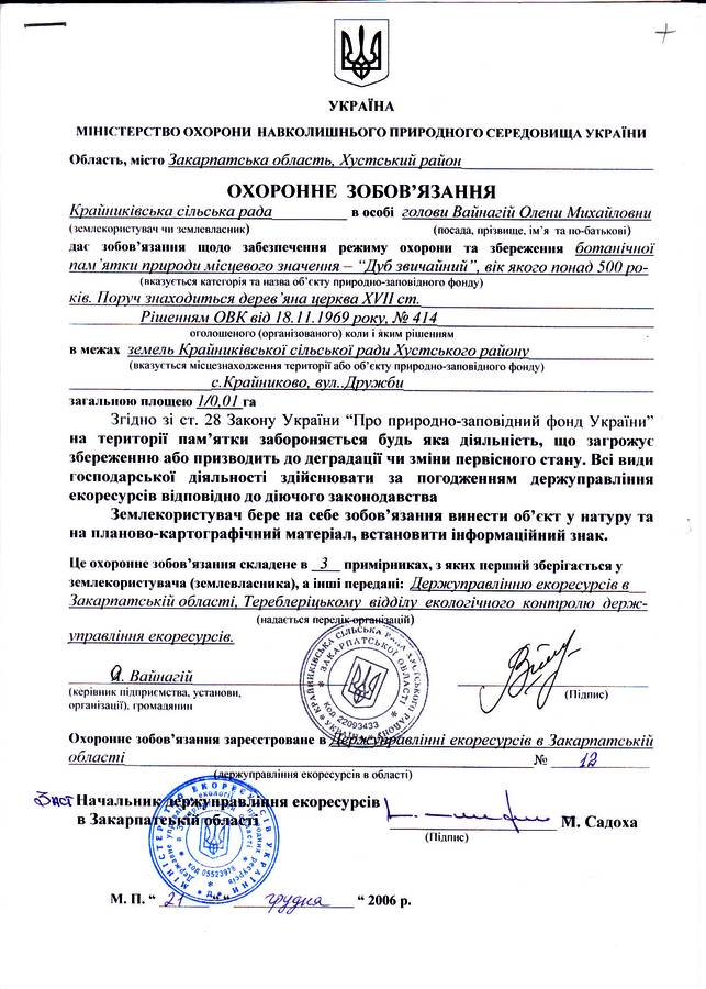 Дуб звичайний Ботанічна пам’ятка природи місцевого значення Площа 0,01 Район Хустський Розташування с. Крайниково, вул. Дружби Приналежність Крайниківська сільська рада Законодавство Ріш.ОВК від 18.11.1969 року № 414, Ріш.ОВК від 23.10.1984 р. № 253 Охороняються 1 дерево, вік якого поанд 500 років. Поруч знаходиться деревяна церква XVII ст. Фотогалерея