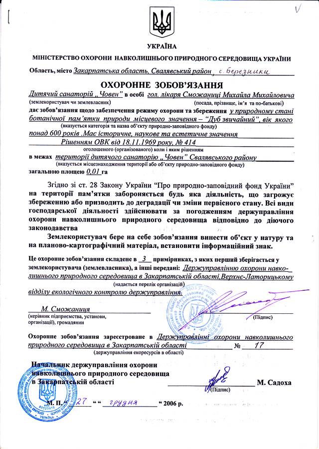Дуб звичайний Ботанічна пам’ятка природи місцевого значення Площа 0,01 Район Свалявський Розташування с. Березники Приналежність Дитячий санаторій "Човен" Законодавство Ріш.ОВК від 18.11.1969 року № 414, Ріш.ОВК від 23.10.1984 № 253 Охороняються дуб звичайний, вік якого понад 600 років. 1 дерево. Має історичне, наукове та естетичне значення. Фотогалерея