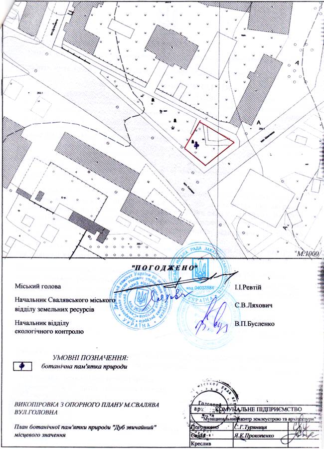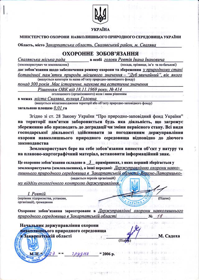 Дуб звичайний Ботанічна пам’ятка природи місцевого значення Площа 0,01 Район Свалявський Розташування м. Свалява, вул. Головна Приналежність Свалявська міська рада Законодавство Ріш.ОВК від 18.11.1969 року № 414, Ріш.ОВК від 23.10.1984 р. № 253 Охороняються дуб звичайний, вік якого понад 300 років. 1 дерево. Фотогалерея