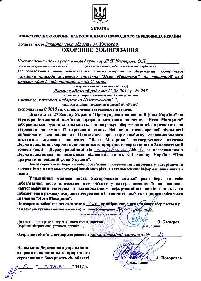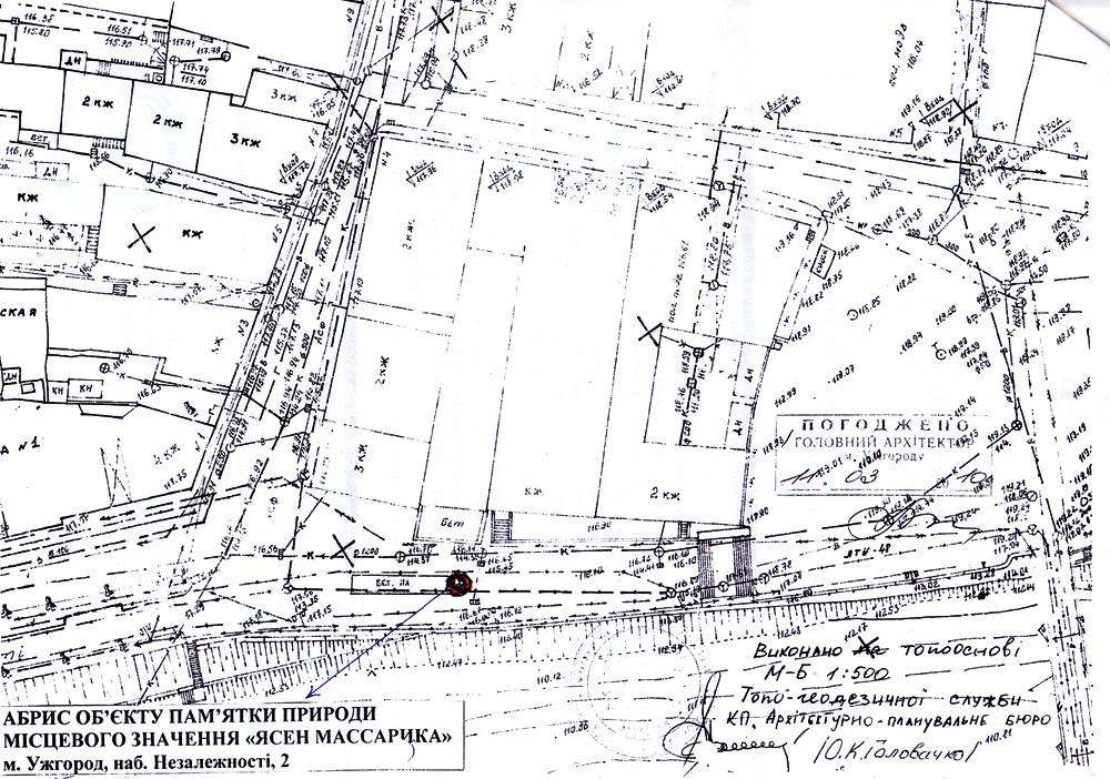 Ясен Масарика Ботанічна пам’ятка природи місцевого значення Площа 0,0016 Район Ужгородський Розташування м. Ужгород, наб. Незалежності, 2 Приналежність Ужгородська міська рада Законодавство Рішення обласної ради від 12 серпня 2011 року № 265 Охороняються один з найстаріших ясенів України, 1 дерево Фотогалерея Ясен Масарика. Фото: О.Цапулич