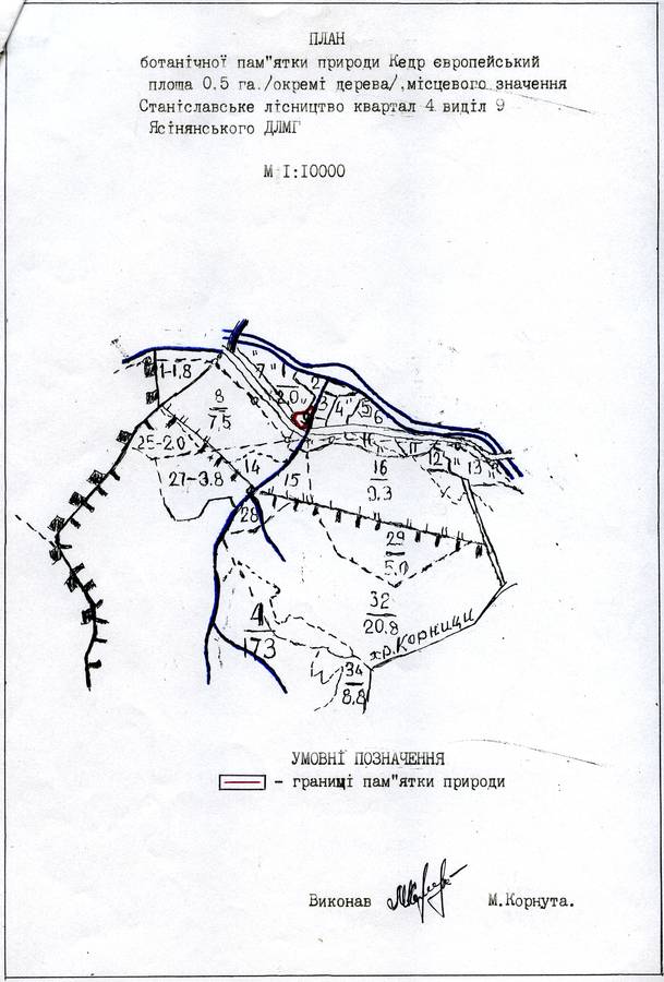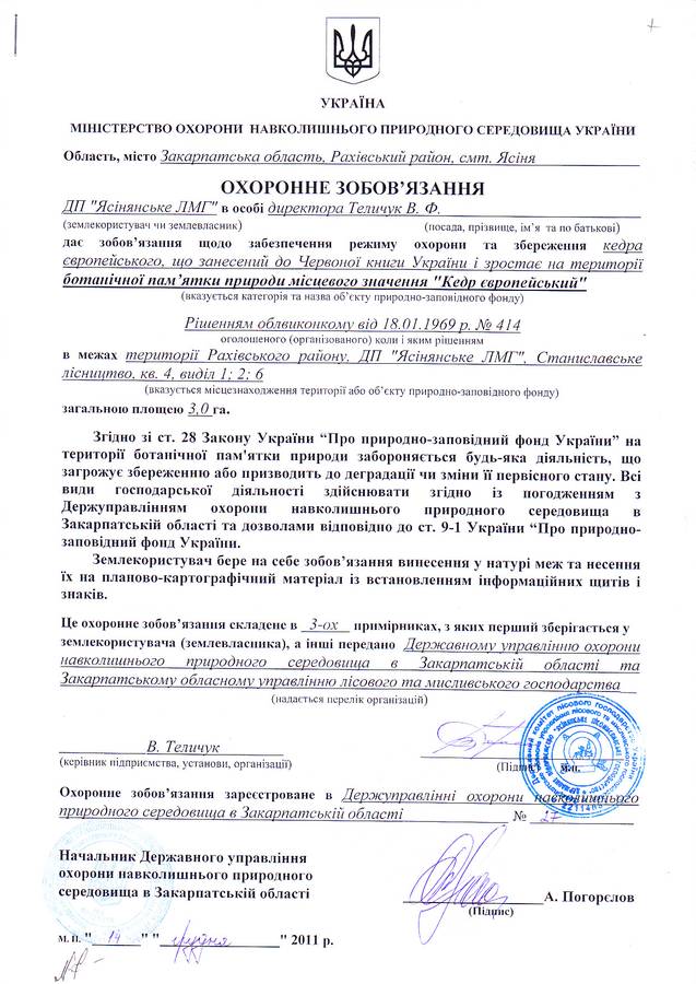 Кедр європейський Ботанічна пам’ятка природи місцевого значення Площа 3,0 Район Рахівський Розташування Станіславське л-во, квартал 4, виділ 2,3,4 Приналежність ДП "Ясінянське ЛМГ" Законодавство Ріш.ОВК від 23.10.1984 р. № 253 Охороняються кедр європейський, 60 дерев Фотогалерея