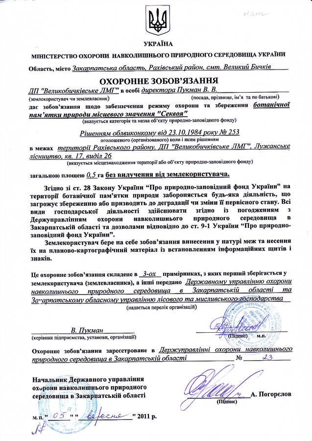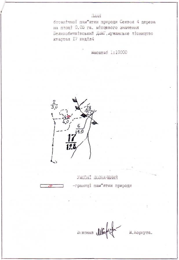 Секвоя Ботанічна пам’ятка природи місцевого значення Площа 0,5 Район Рахівський Розташування Лужанське л-во, квартал 17, виділ 26 Приналежність ДП "Великобичківське ЛМГ" Законодавство Ріш.ОВК від 18.11.1969 року № 414, Ріш.ОВК від 23.10.1984 № 253 Охороняються секвоя, віком 90 років, 4 дерева Фотогалерея