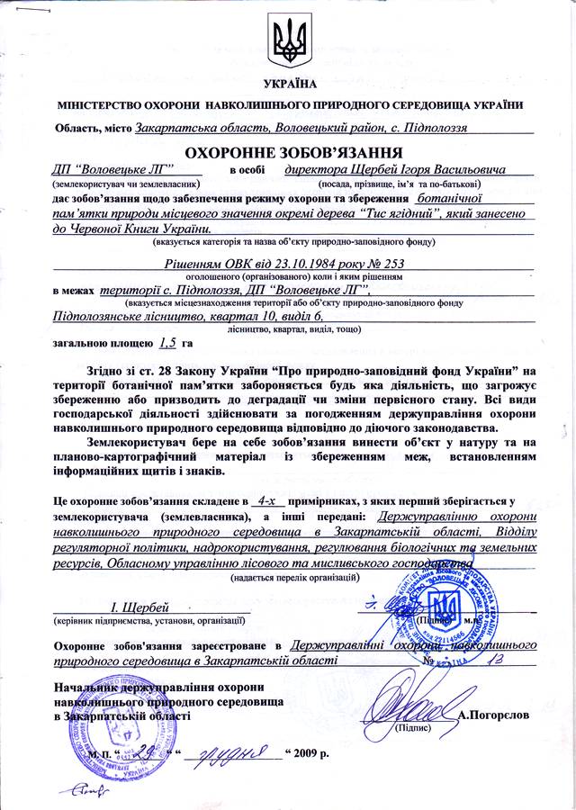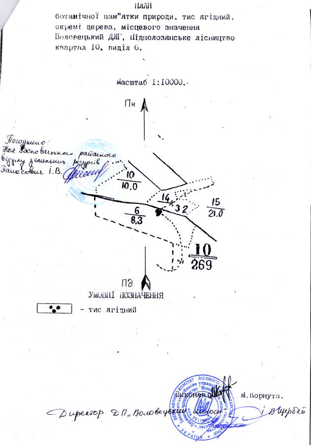 Тис ягідний Ботанічна пам’ятка природи місцевого значення Площа 1,5 Район Воловецький Розташування Підполозянське л-во, квартал 10, виділ 6 Приналежність ДП "Воловецьке ЛГ" Законодавство Ріш.ОВК від 18.11.1969 року № 414, Ріш. ОВК від 23.10.1984 р., № 253 Охороняються окремі дерева тису ягідного, який занесено до Червоної книги України Фотогалерея
