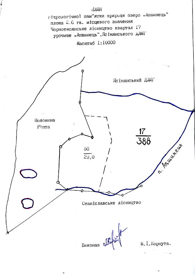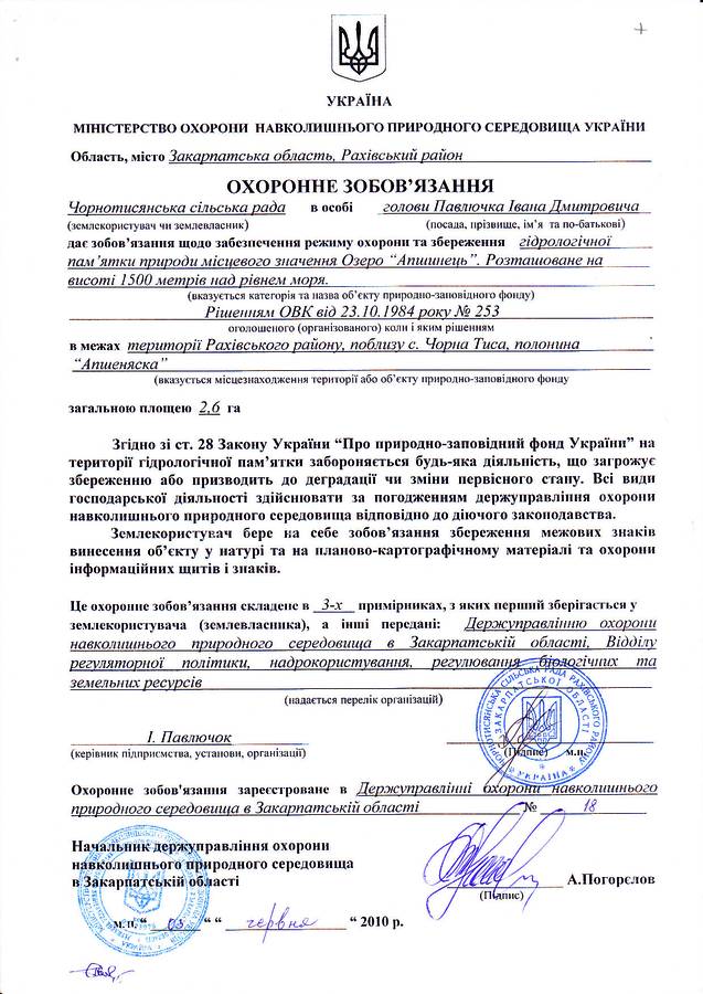 Озеро Апшинець Гідрологічна пам’ятка природи місцевого значення Площа 2,6 Район Рахівський Розташування полонина Апшиняска Приналежність Чорнотисянська сільська рада Законодавство Ріш.ОВК від 18.11.1969 року № 414, Ріш.ОВК від 23.10.1984 р. № 253 Охороняються Високогірне озеро на висоті 1500 м.н.р.м. з кришталево чистою водою, населене фореллю. Фотогалерея