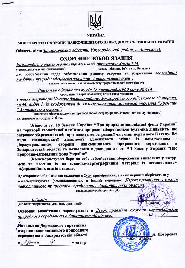 - Ріш. ОВК від 18.11.1969 р. № 414 (знаходиться на території лісового заказника загальнодержавного значення "Анталівська поляна")