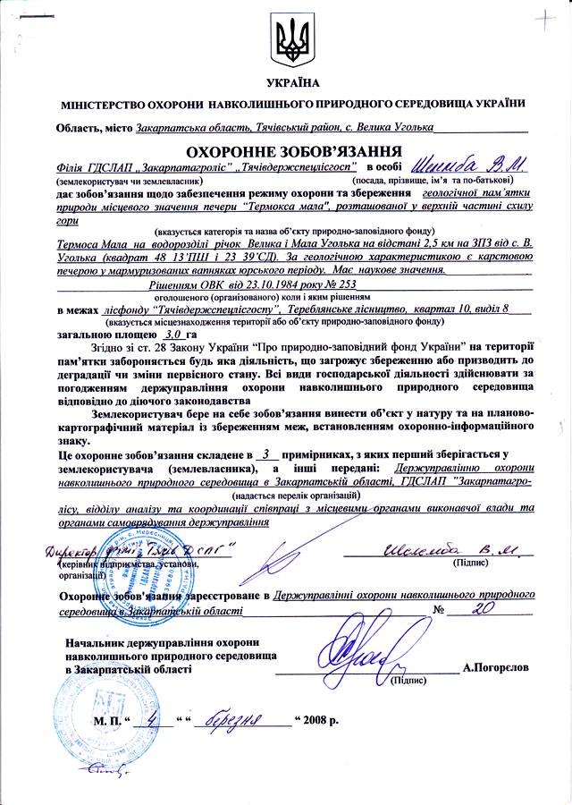 - карстова печера, що розташована у верхній частині схилу гори Термокса Мала на водорозділі річок Велика і Мала Уголька на відстані 2,5 км від ЗПЗ від с.В.Уголька. За геологічною характеристикою є карстовою печерою у мармуризовних вапняках юрського періоду. Має наукове значення.