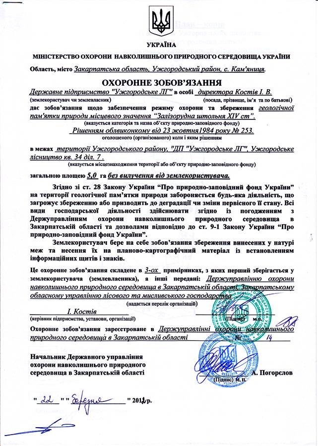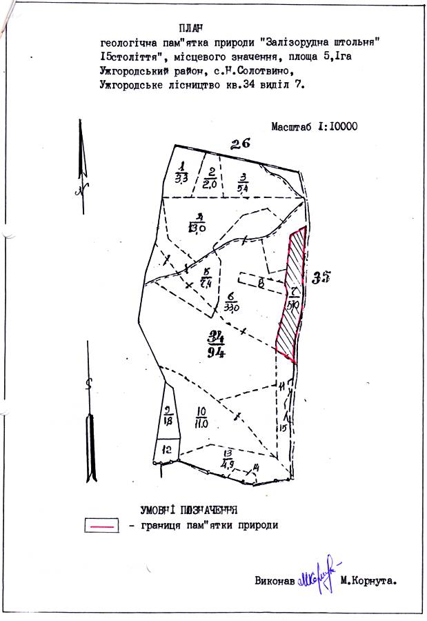 Залізорудна штольня XIV ст. Геологічна пам’ятка природи місцевого значення Площа 5 Район Ужгородський Розташування Ужгородське л-во, квартал 34, виділ 7 Приналежність ДП "Ужгородське ЛГ" Законодавство Ріш.ОВК від 18.11.1969 року № 414, Ріш. ОВК від 23.10.1984 р. № 253 Охороняються шахта, яка має важливе історичне та наукове значення Фотогалерея