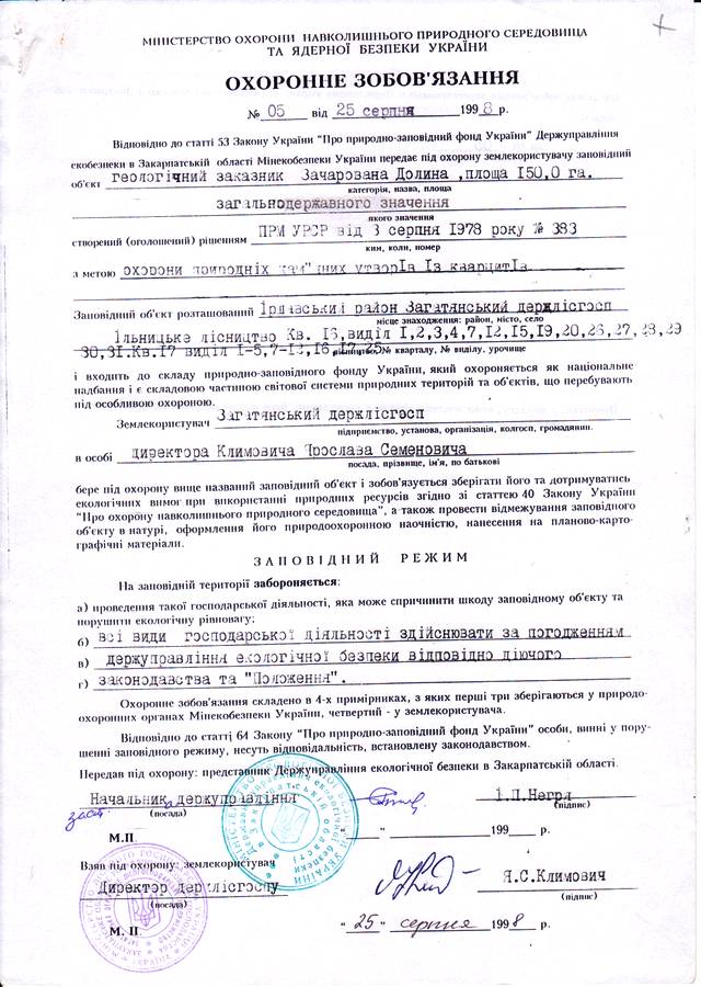 - Ріш. ОВК від 25.07.1972 р. № 243, ПРМ УРСР від 28.10.1974 р. № 500, ПРМ УРСР від 03.08.1978 р. № 383, Ріш.ОВК від 23.10.1984 р. № 253, (входить до складу НПП "Зачарований край" з вилученням)