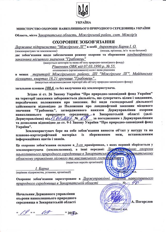 Грабовець Ландшафтний заказник місцевого значення Площа 188,6 Район Міжгірський Розташування Майданське л-во, урочище Грабовець, квартали 18, 21 Приналежність ДП "Міжгірське ЛГ" Законодавство Ріш.ОВК від 07.03.1990 р. № 55 Охороняються темнохвойни і мішаний ліс. Охорона реліктового насадження сосни звичайної. Фотогалерея