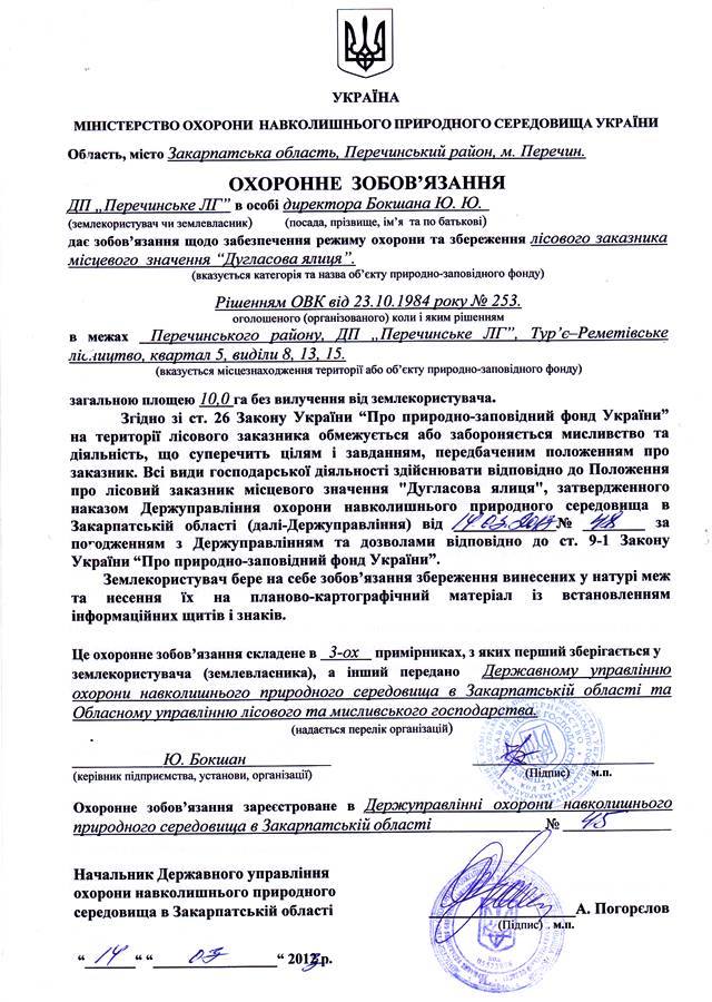 - Ріш. ОВК від 25.07.1972 р. № 243 ("Дугласова смерека"), Ріш.ОВК від 23.10.1984 р. № 253, (знаходиться на території заповідного урочища місцевого значення "Розтоки")