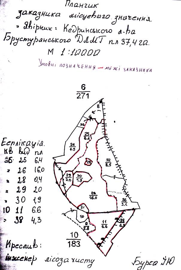 - Кедринське л-во, квартал 6, виділ 25, 26, 28, 29, 30, квартал 10, виділ 11, 38