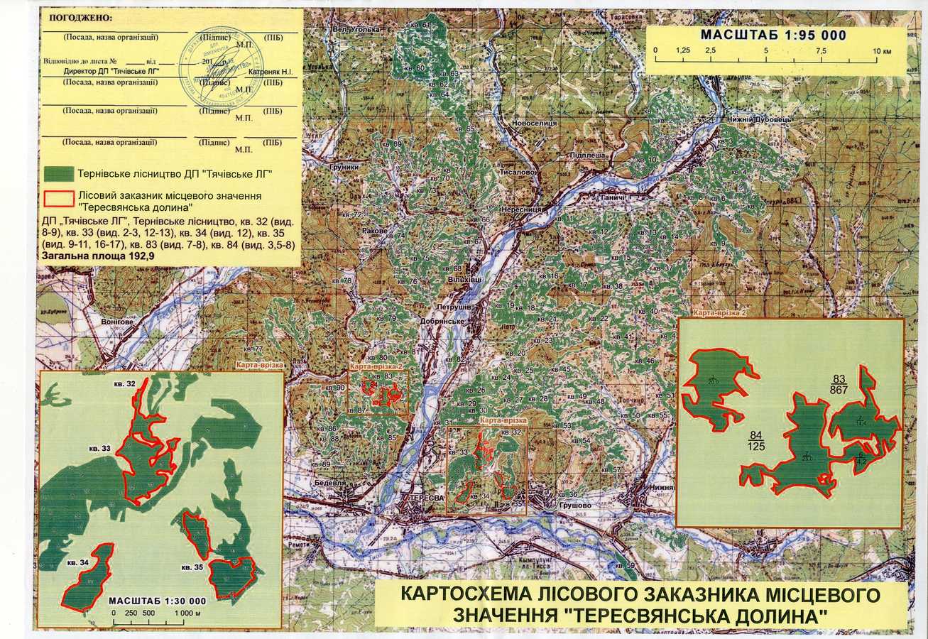 - Тернівське л-во квартал 32 виділ 8, 9, квартал 33 виділ 2, 3, 12, 13, квартал 34 виділ 12, квартал 35 виділ 9, 10, 11, 16, 17, квартал 83 виділ 7, 8, квартал 84 виділ 3, 5, 6, 7, 8
