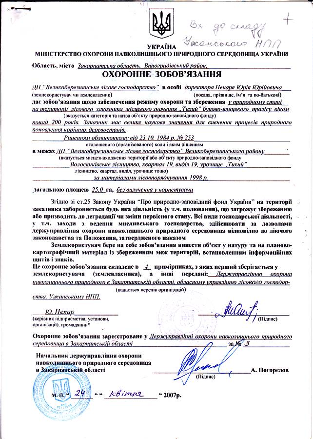 - Ріш.ОВК від 18.11.1969 року № 414, Ріш.ОВК від 25.07.1972 р. № 243, Ріш.ОВК від 23.10.1984 р. № 253 (Увійшов до складу Ужанського НПП без вилучення площі, Указ Презид. від 27.09.1999 р.№ 1230/99)