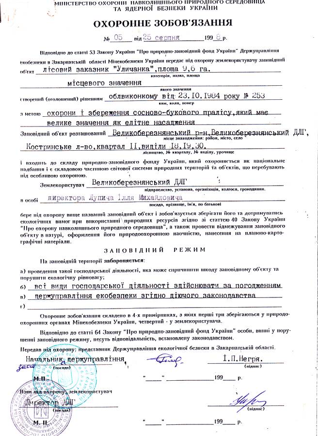 - Ріш.ОВК від 18.11.1969 року № 414, Ріш.ОВК від 25.07.1972 р. № 243 (10,0 га), Рішення ОВК від 23.10.1984 р. № 253 (Увійшов до складу Ужанського НПП Указ Презид. від 27.09.1999 р.№ 1230/99)