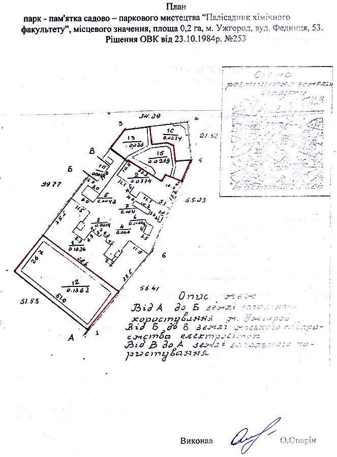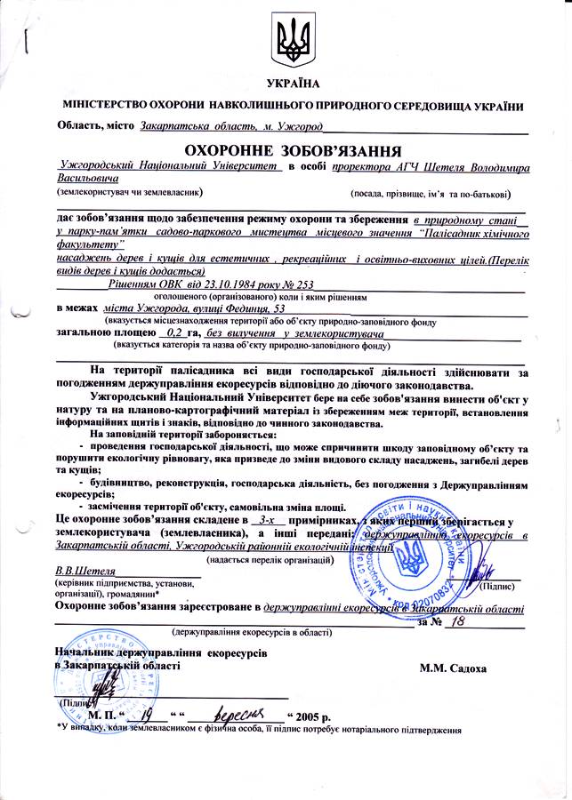 Палісадник хімкорпусу держуніверситету Парк-пам’ятка садово-паркового мистецтва місцевого значення Площа 0,2 Район Ужгородський Розташування м. Ужгород, вул. Фединця, 53 Приналежність УжНУ Законодавство Ріш. ОВК від 18.11.1969 р. № 414 Охороняються насадження дерев і кущів для естетичних, рекреаційних, і освітньо-виховних цілей Фотогалерея Палісадник хімічного корпусу УжНУ. Фото: О.Цапулича