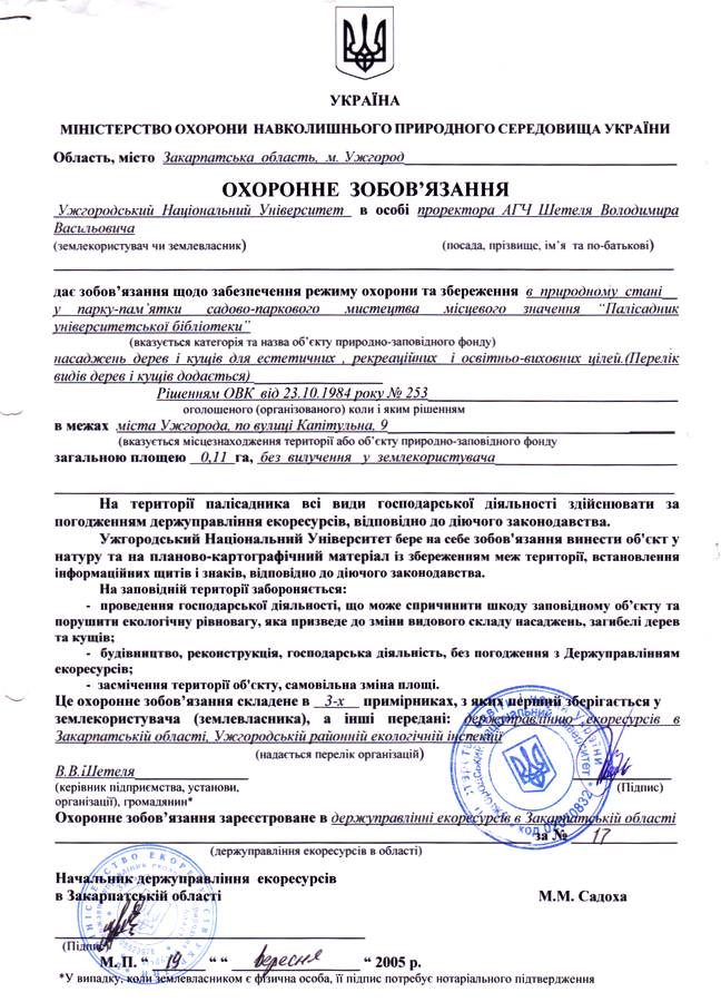 Палісадник університетської бібліотеки Парк-пам’ятка садово-паркового мистецтва місцевого значення Площа 0,5 Район Ужгородський Розташування м. Ужгород, вул. Капітульна, 9 Приналежність УжНУ Законодавство Ріш. ОВК від 18.11.1969 р. № 414, Ріш. ОВК від 25.07.1972 р. № 243 Охороняються насадження дерев і кущів для естетичних, рекреаційних, і освітньо-виховних цілей Фотогалерея