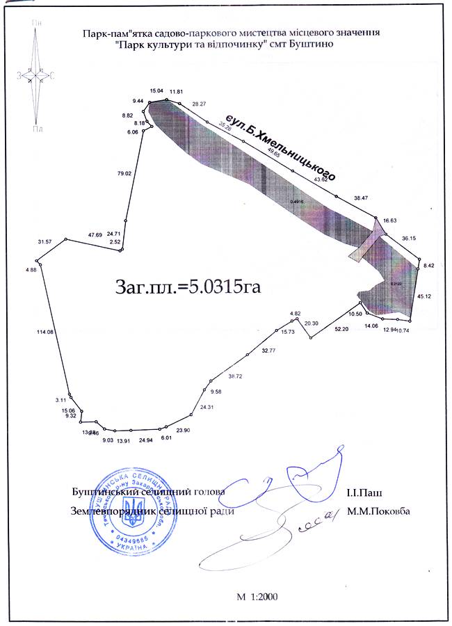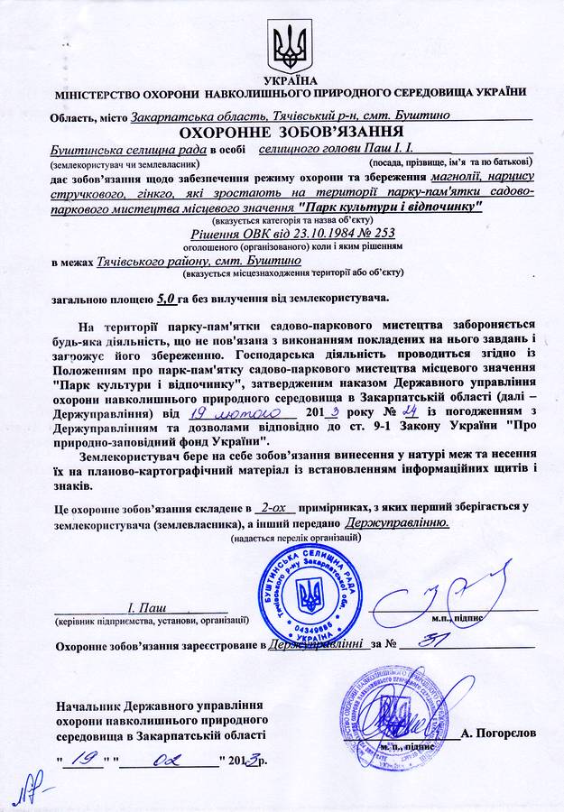 Парк культури і відпочинку Парк-пам’ятка садово-паркового мистецтва місцевого значення Площа 5,0 Район Тячівський Розташування смт. Буштино Приналежність Буштинська селищна рада Законодавство Ріш. ОВК від 18.11.1969 р. № 414, Ріш. ОВК від 23.10.1984 р. № 253 Охороняються магнолія, нарцис стручковий, гінкго. Всього 30 видів. Фотогалерея