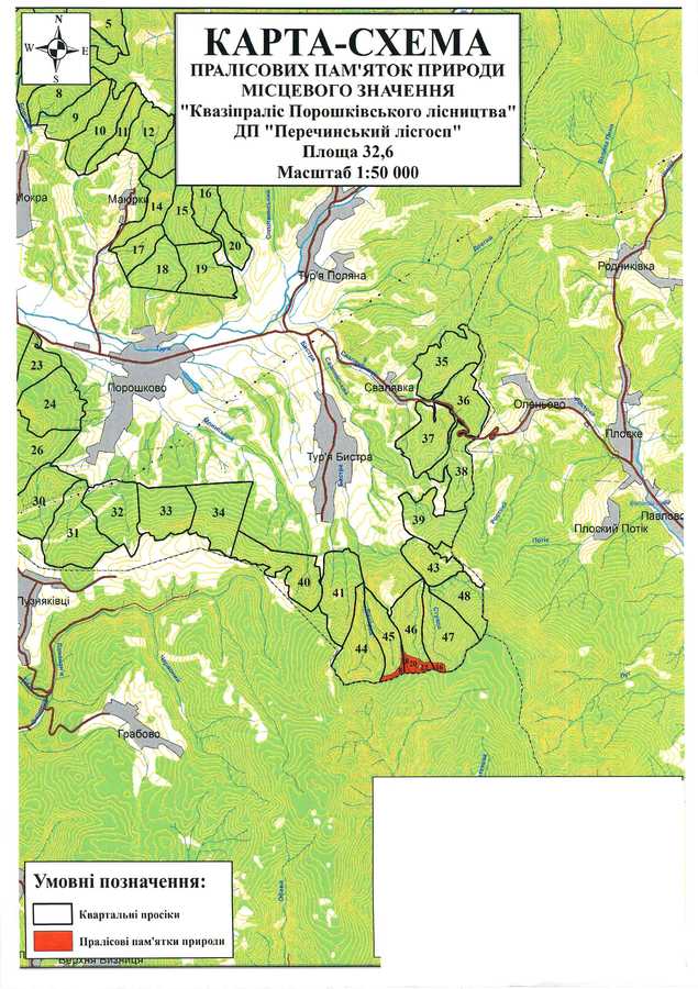 - Порошківське л-во, квартал 45 (виділ 8), квартал 46 (виділ 18, 20, 22), квартал 47 (виділ 16)