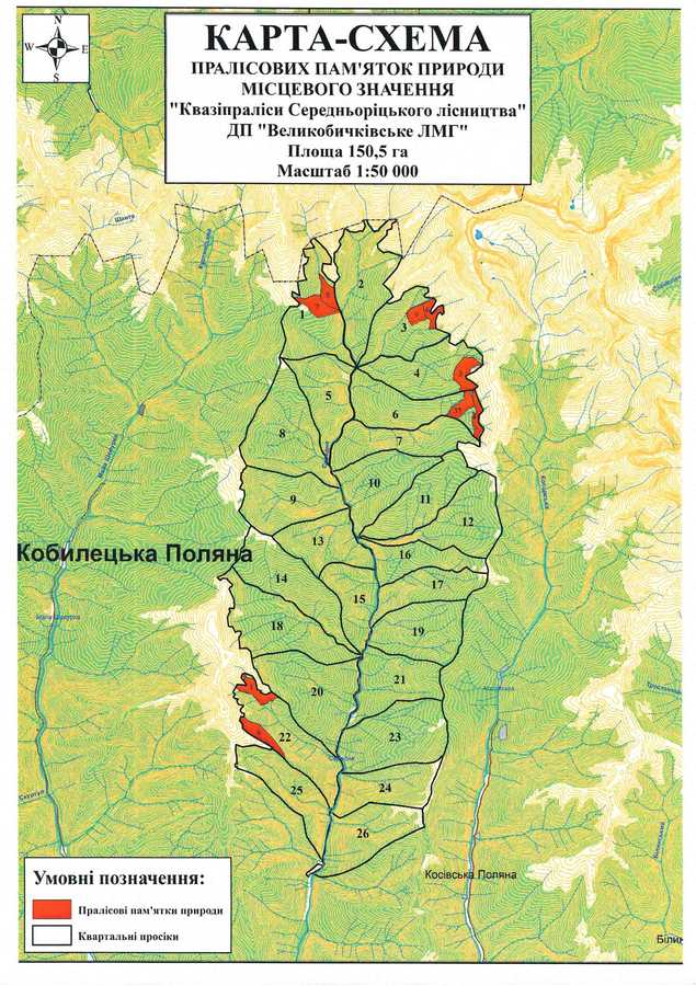 - Середньоріцьке л-во, квартал 1 (виділи 7, 8), 3 (виділи 6, 9), 4 (виділ 3), 6 (виділи 37, 41), 22 (виділи 1, 6)