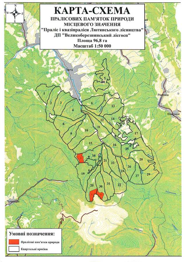 - Лютянське л-во, квартал 18 (виділ 2), 20 (виділ 3), 30 (виділ 1)
