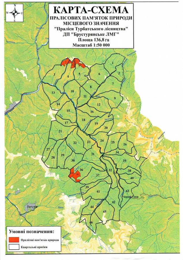 Турбатське л-во, квартал 3 (виділ 2), 4 (виділи 1, 5, 6, 7), 5 (виділи 1, 6), 36 (виділи 43, 59)